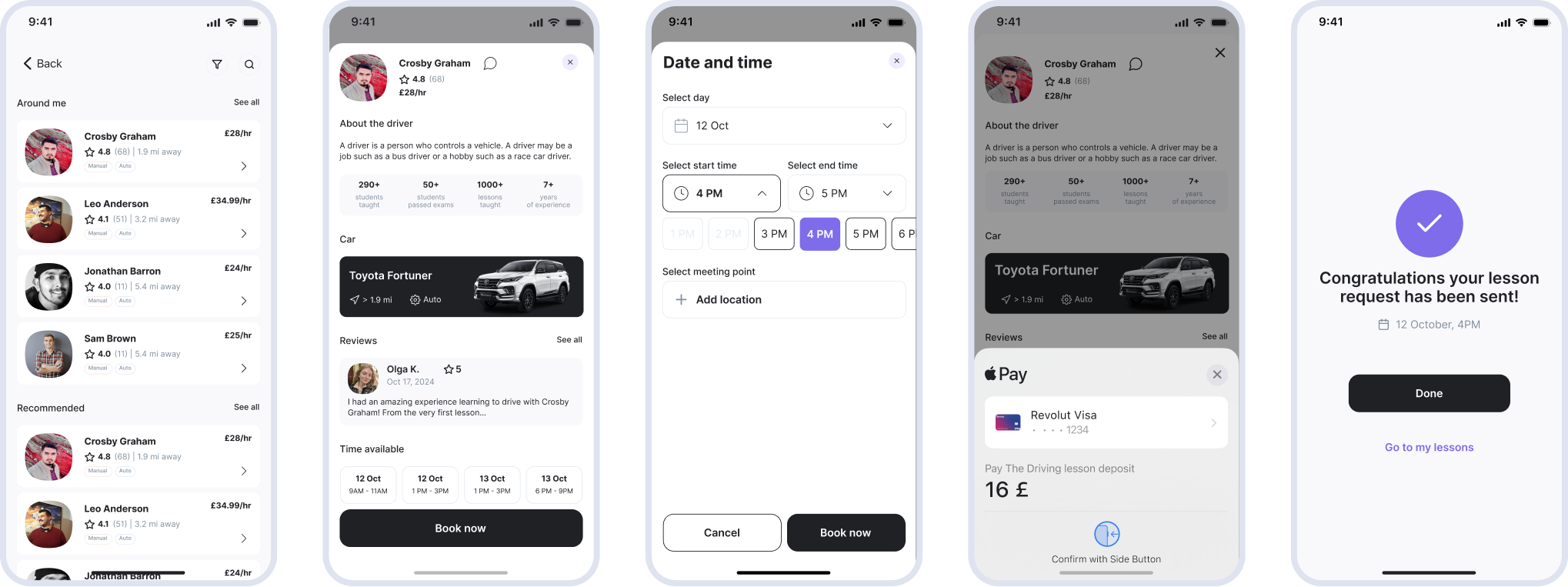 Learners can easily search for instructors, choose a date, time, and pickup location, and confirm bookings instantly once accepted by the instructor.